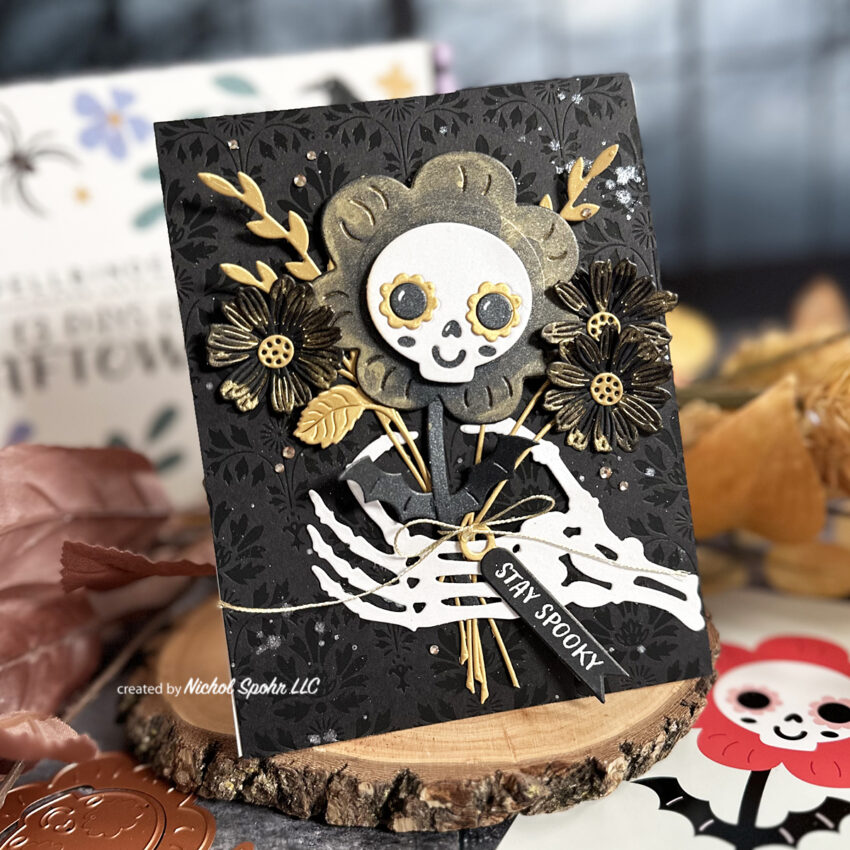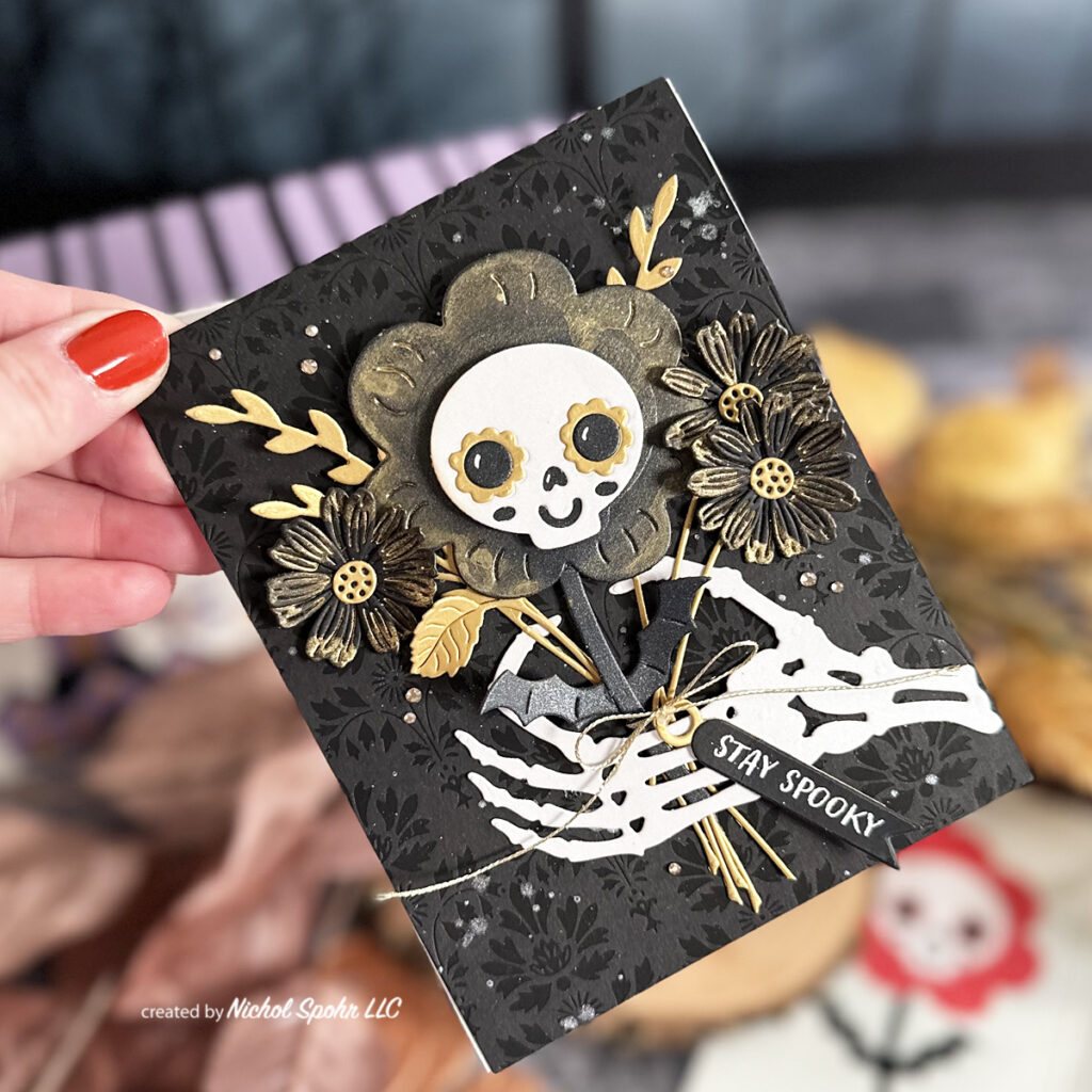 Welcome to Day 10 of Craftoween! Today’s card project is one of the most dramatic looks in the series so far, a moody black and gold Day of the Dead–inspired floral bouquet.