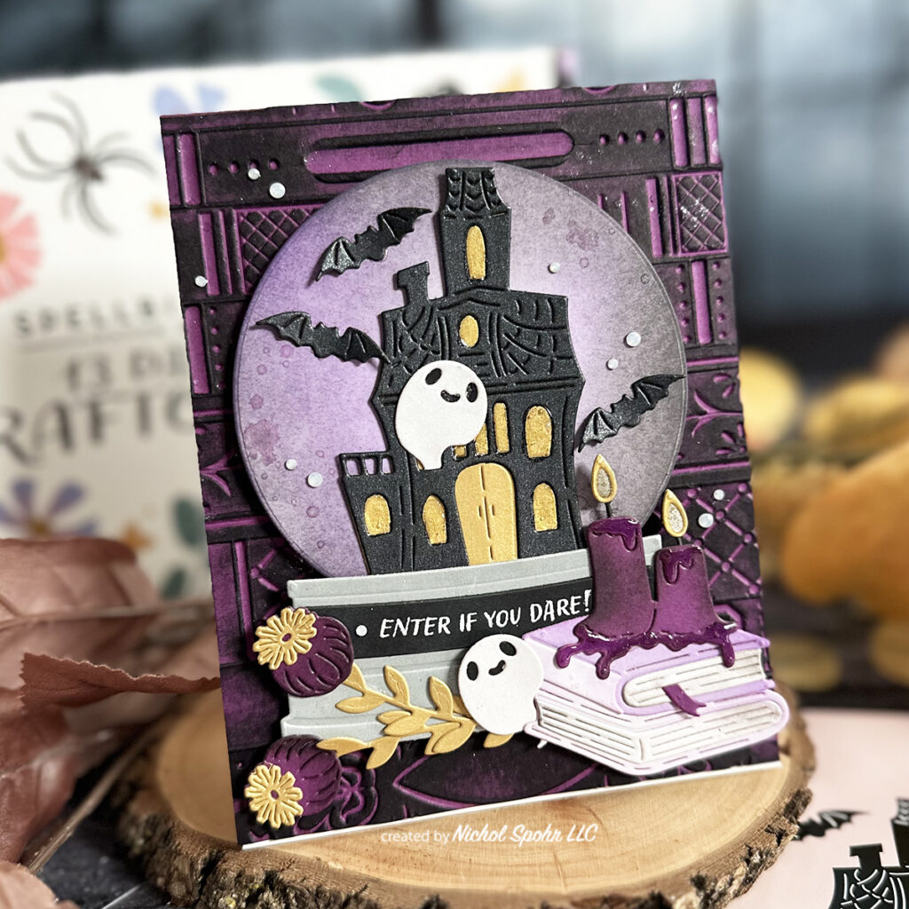 For today’s Craftoween project, I’m sharing another spooky snow globe design—this time built around the haunted house from the Day 11 envelope. I combined it with a few of my favorite past elements: the ghost from Day 8, the books and candles from Day 7, and some florals for a little extra texture. To finish things off, I added a book embossing folder background, which ties everything together beautifully.