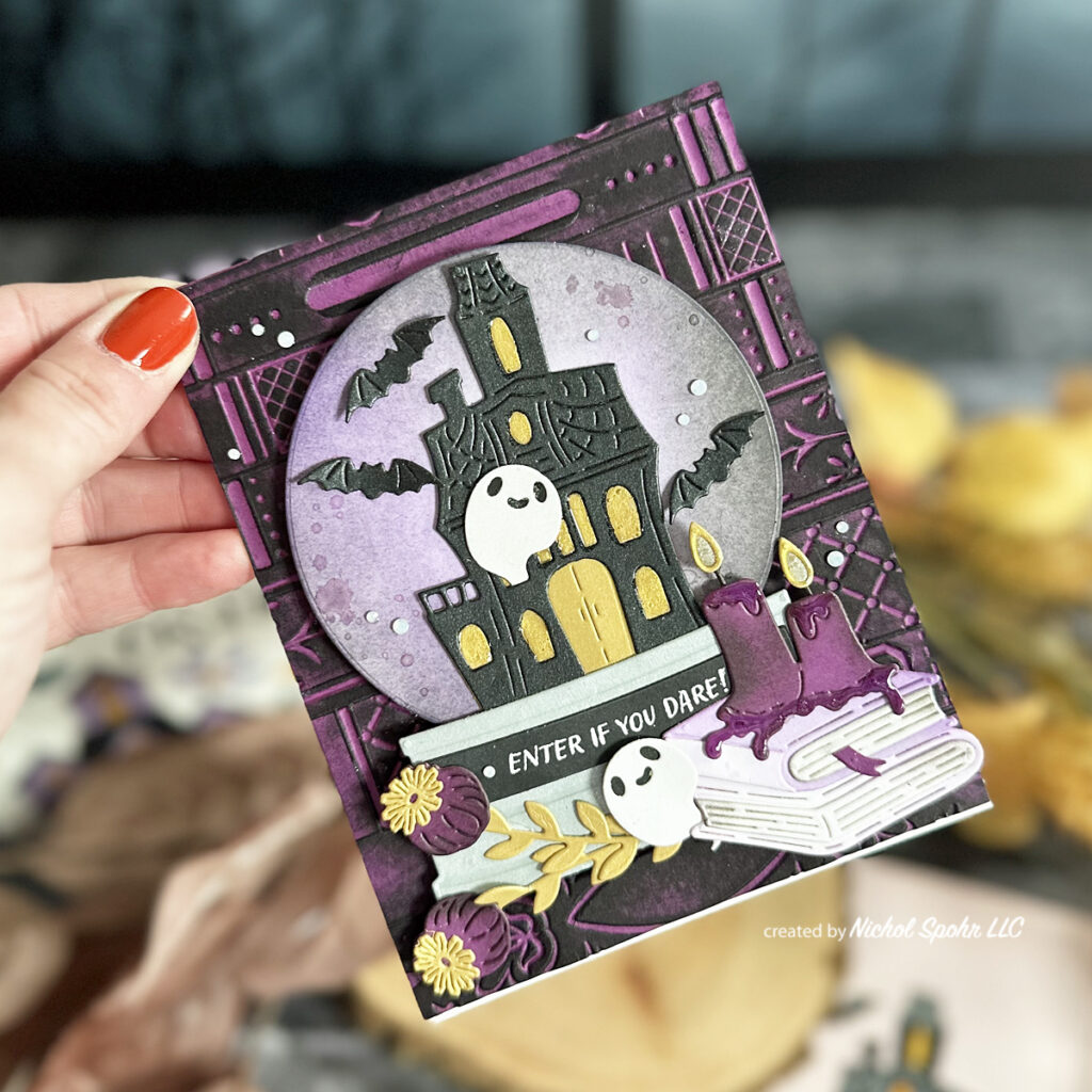 This card feels like a haunted storybook scene captured inside a snow globe, and I love the layered, detailed effect.