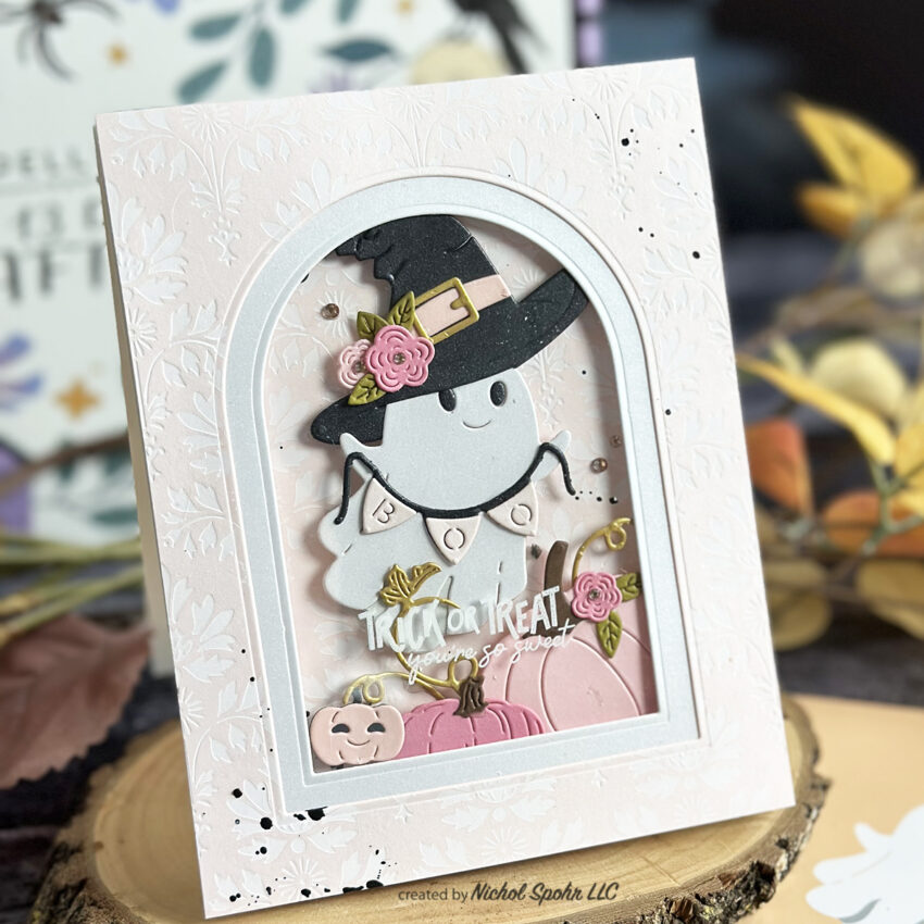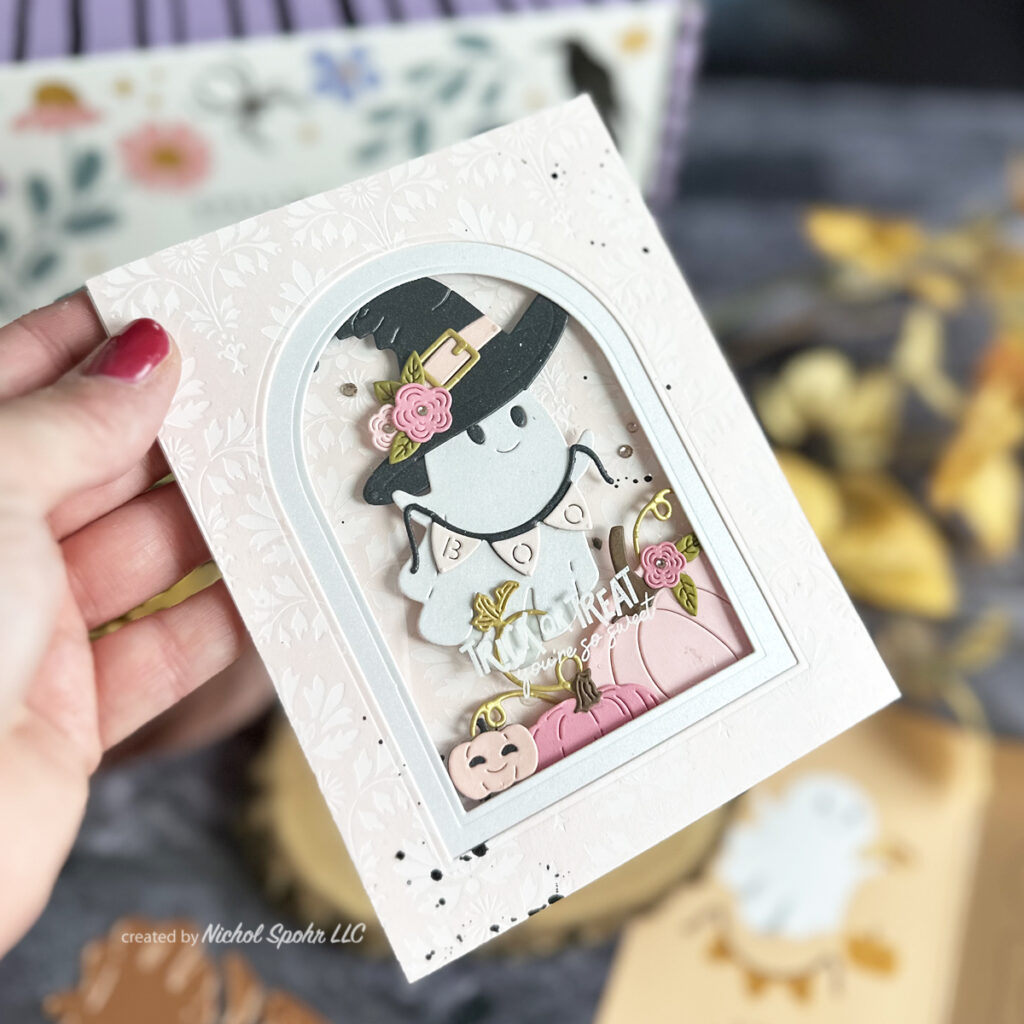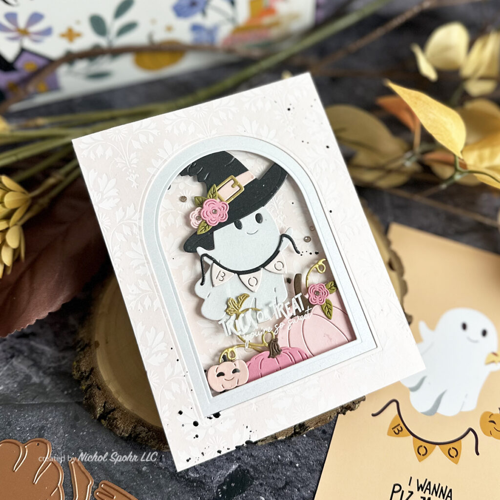 For extra fun, I created an acetate window stamped with the Craftoween box stamp set and dressed up my little ghostie with pieces from the Faux Embroidered Pumpkin set—including a witch hat, flowers, leaves, and a big pumpkin.