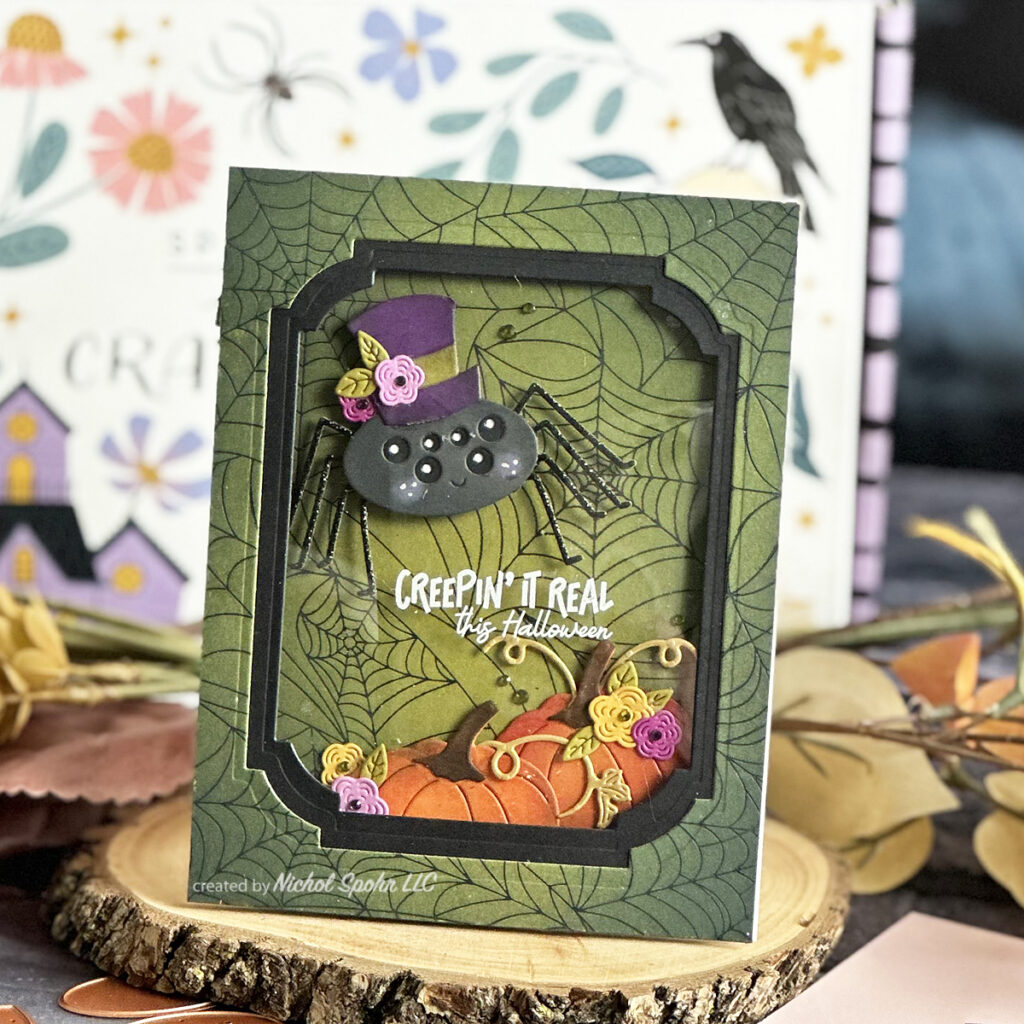 Today’s card continues the theme of fun window openings with an acetate overlay, much like yesterday’s project. This time, though, we’re spotlighting the adorable little spider from the Day 5 die set! I dressed him up with his jaunty top hat and a few tiny flowers for extra charm, then paired him with pumpkins and a glimmered spider web background.
