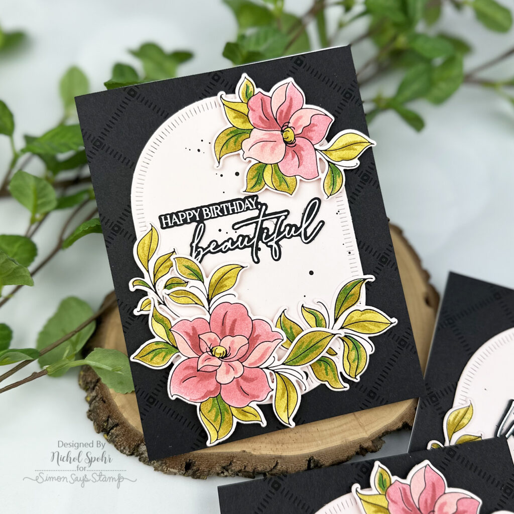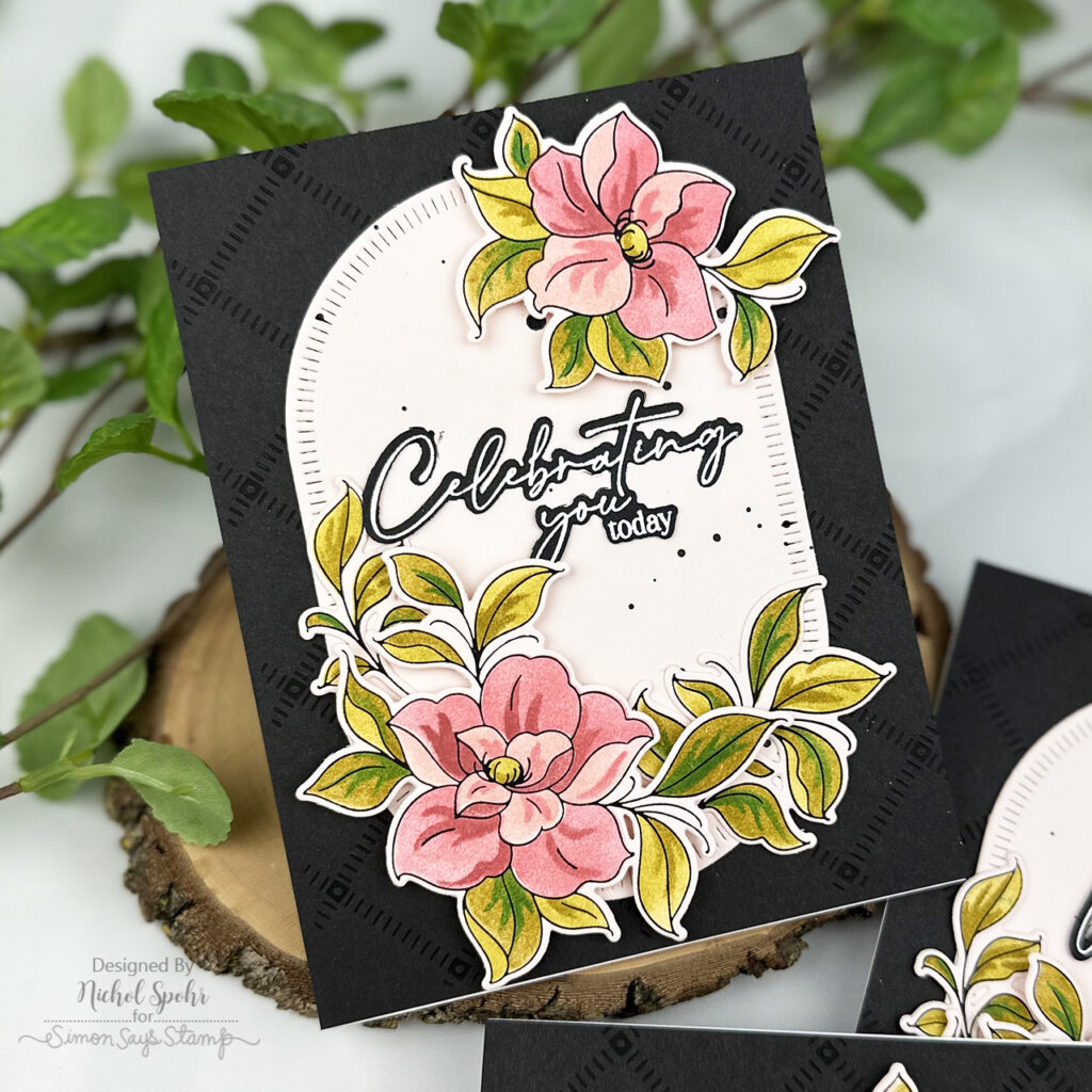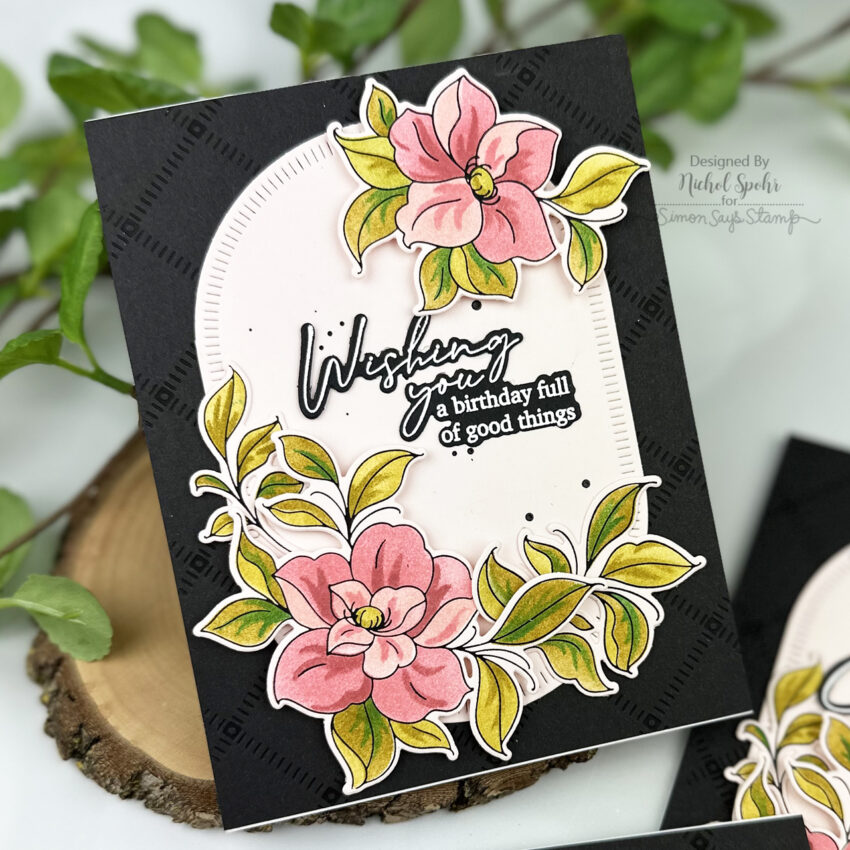 The Pinkfresh Studio Daydream Edit release is filled with gorgeous florals and versatile sentiments, and today I’m sharing a set of three bold floral birthday cards featuring the Floral Daydream and Celebrate in Blooms products. I started with a subtle black-on-black glimmer background for added texture, layered on a die cut elongated oval frame, and finished the designs with foiled and stenciled florals on soft pink cardstock. These cards come together with a few simple techniques but have a really striking, polished look.