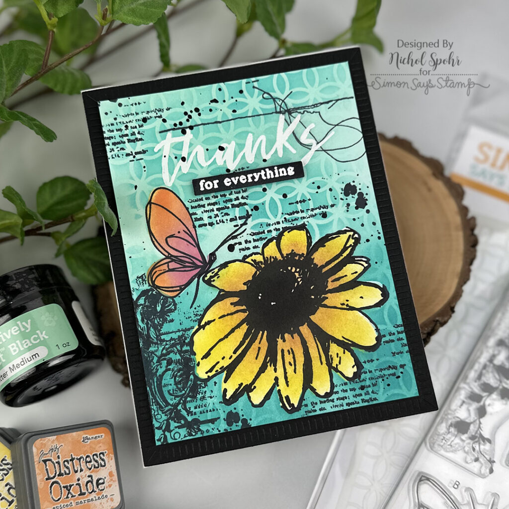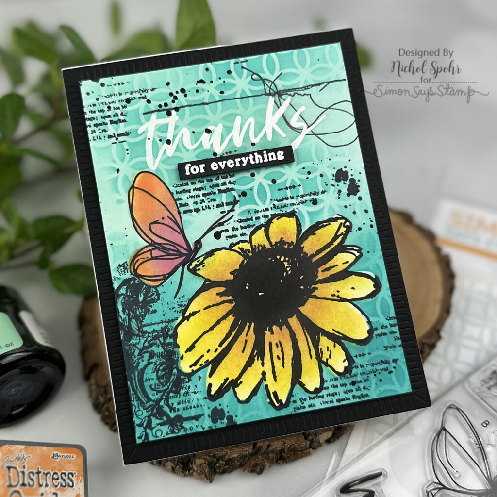 Today’s card features components from the Simon Says Stamp April 2026 Card Kit, where I combined creative masking with stamping, inking, and stenciling to build a layered mixed media design. Even though this card has lots of depth and detail, it remains almost one layer thanks to strategic masking and thoughtful placement of each element. I especially love how the 6×8 stamp set pairs with both the stencils and masking stencils to create a cohesive, dimensional background without adding bulk.