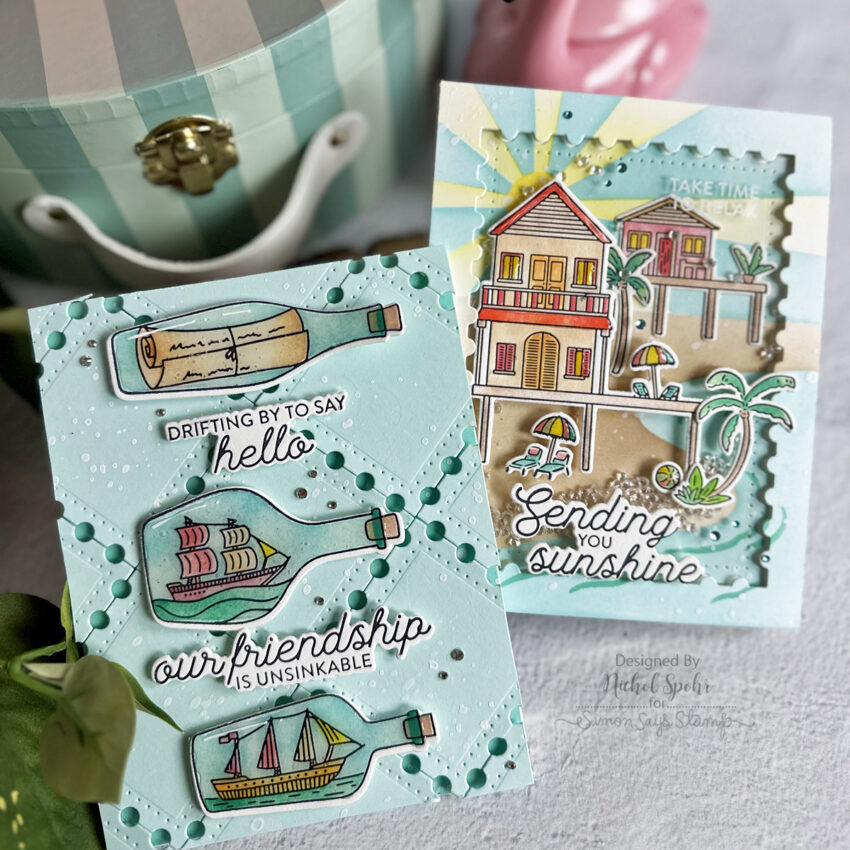 Beautiful cards & such a creative way to use the reverse postage die cut to highlight the Coastal paradise cottages.