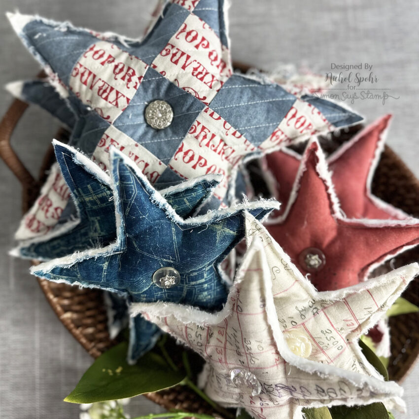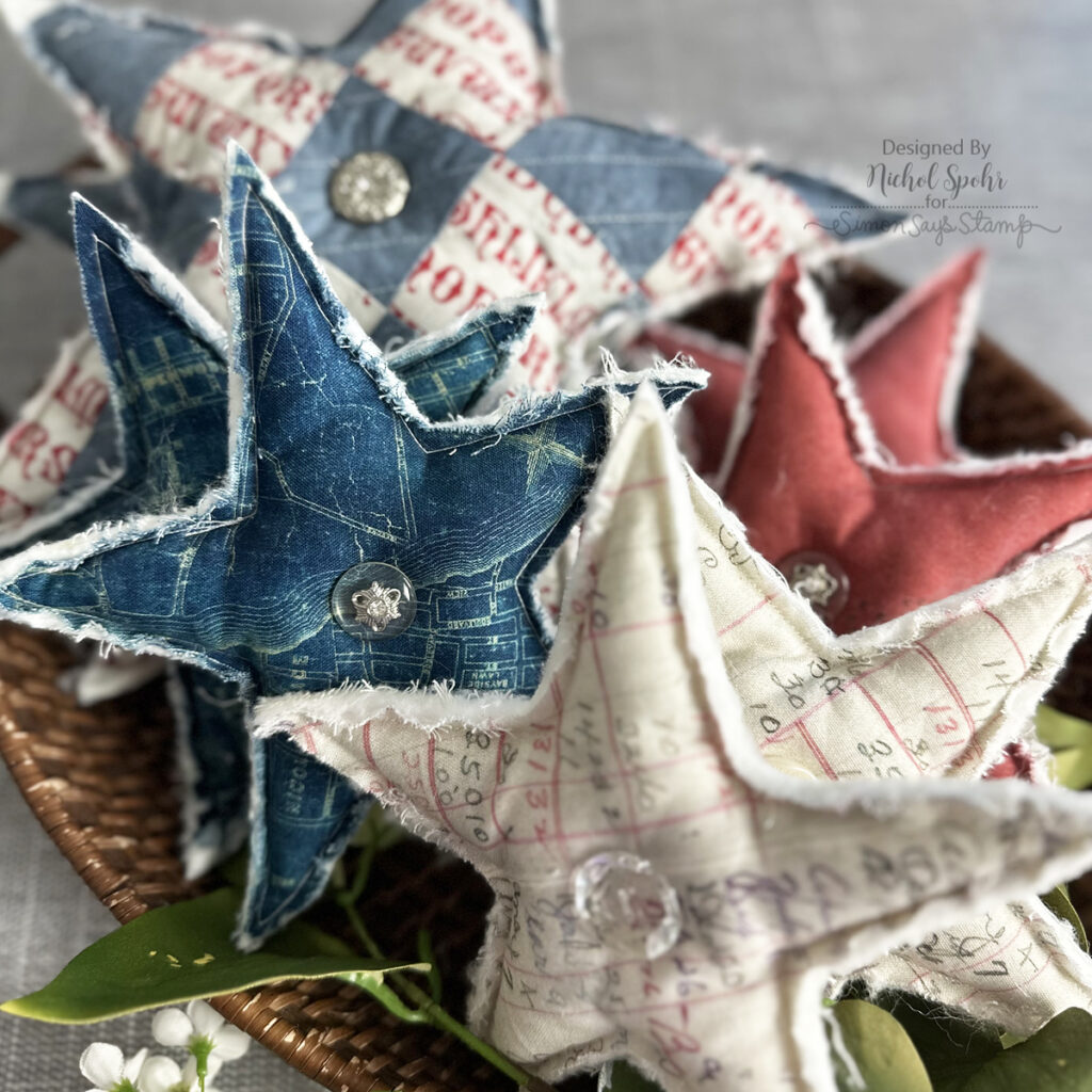 Today I’m sharing a batch of fabric stars I created using Tim Holtz red, white, and blue fabrics, and I’m in love with how rustic and charming they turned out!