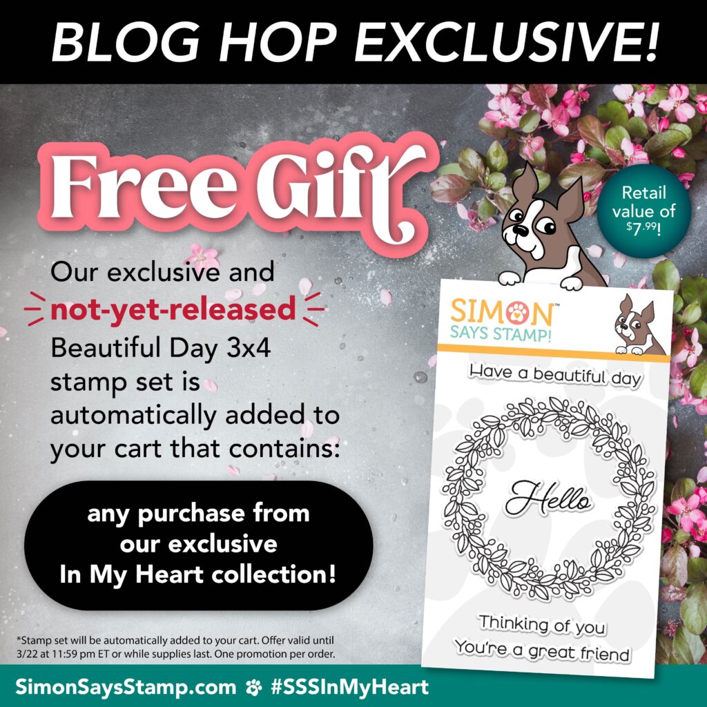 Happy Saturday and welcome to the Simon Says Stamp In My Heart Blog Hop! Today’s card features a variety of products from the March 2026 release. I love mixing and matching die cuts and images to build detailed scene cards, and this design is full of spring charm. A sweet bunny dances among layered florals in front of a scalloped arch shaker frame, all brought together with soft, fresh colors for the perfect seasonal look.