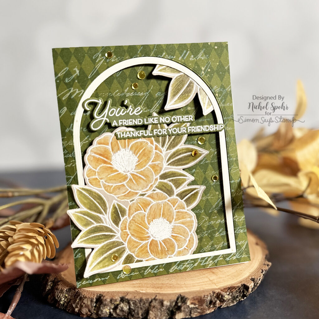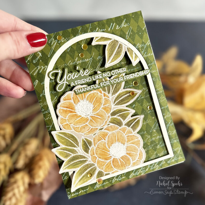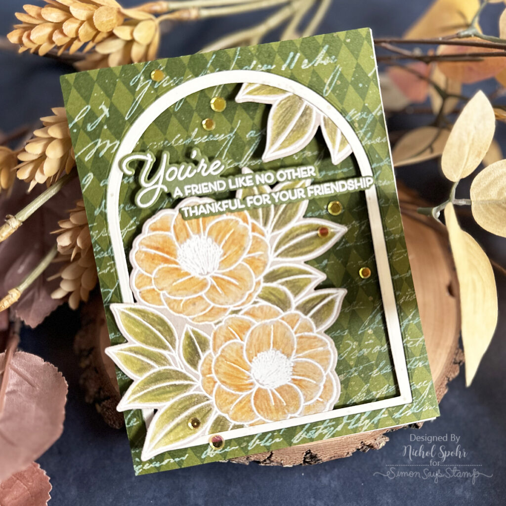 Today I’m sharing a beautiful floral card created with the Alex Syberia Beautiful Soul Set for Simon Says Stamp. I colored the images with Tim Holtz Distress Pencils and paired them with a multi-stamped background for extra impact. I love how this one came together—it’s such a perfect mix of bold and delicate details.