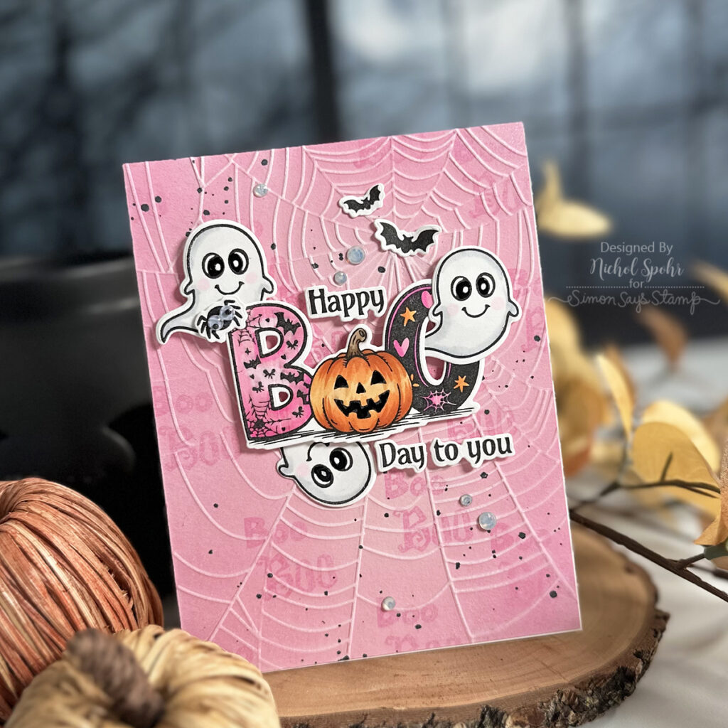 Lately, I’ve been loving the playful twist of adding pink into my Halloween projects—it’s such a fun and unexpected pop of color! To finish the design, I incorporated Simon Says Stamp’s Droopy Web embossing folder and some inky blending techniques.